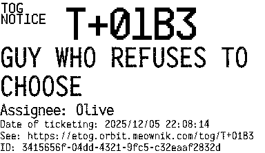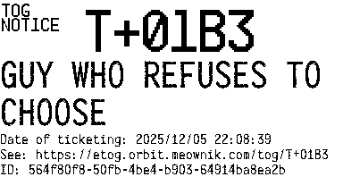 Orbit eTOG Listing Service: T+01B3 GUY WHO REFUSES TO CHOOSE