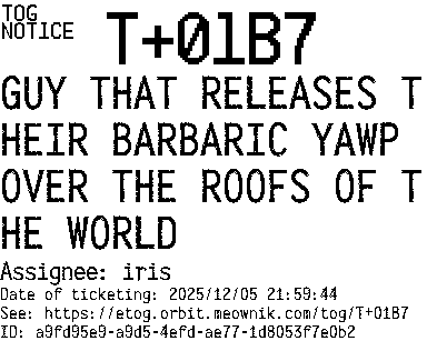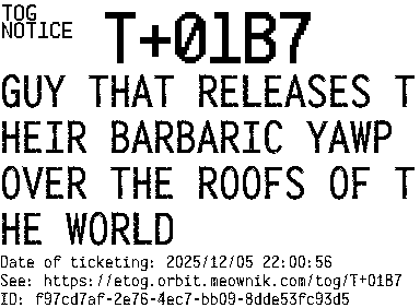Orbit eTOG Listing Service: T+01B7 GUY THAT RELEASES THEIR BARBARIC YAWP OVER THE ROOFS OF THE WORLD