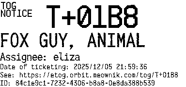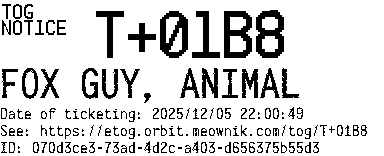 Orbit eTOG Listing Service: T+01B8 FOX GUY, ANIMAL