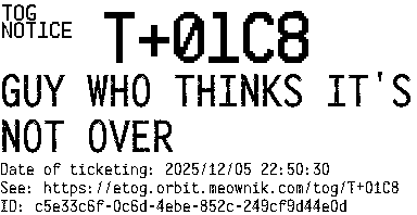 Orbit eTOG Listing Service: T+01C8 GUY WHO THINKS IT'S NOT OVER