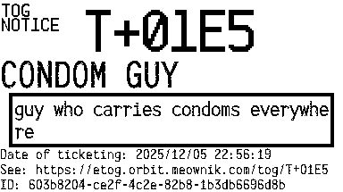 Orbit eTOG Listing Service: T+01E5 CONDOM GUY