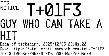 Orbit eTOG Listing Service: T+01F3 GUY WHO CAN TAKE A HIT