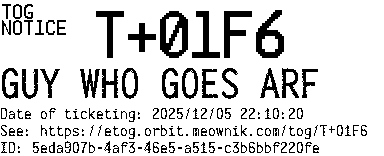 Orbit eTOG Listing Service: T+01F6 GUY WHO GOES ARF