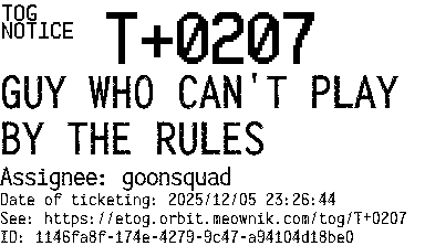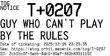 Orbit eTOG Listing Service: T+0207 GUY WHO CAN'T PLAY BY THE RULES