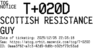 Orbit eTOG Listing Service: T+020D SCOTTISH RESISTANCE GUY