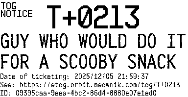 Orbit eTOG Listing Service: T+0213 GUY WHO WOULD DO IT FOR A SCOOBY SNACK