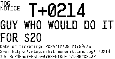 Orbit eTOG Listing Service: T+0214 GUY WHO WOULD DO IT FOR $20