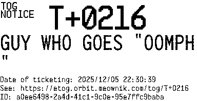 Orbit eTOG Listing Service: T+0216 GUY WHO GOES "OOMPH"