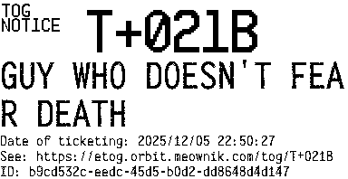 Orbit eTOG Listing Service: T+021B GUY WHO DOESN'T FEAR DEATH