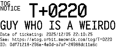 Orbit eTOG Listing Service: T+0220 GUY WHO IS A WEIRDO