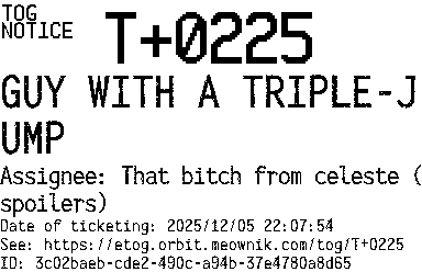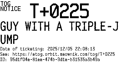Orbit eTOG Listing Service: T+0225 GUY WITH A TRIPLE-JUMP