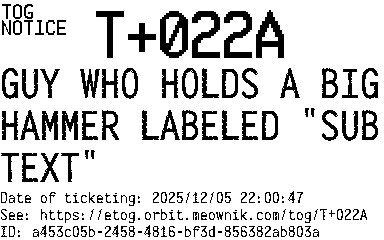 Orbit eTOG Listing Service: T+022A GUY WHO HOLDS A BIG HAMMER LABELED "SUBTEXT"