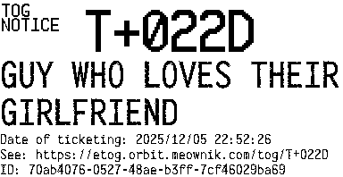Orbit eTOG Listing Service: T+022D GUY WHO LOVES THEIR GIRLFRIEND
