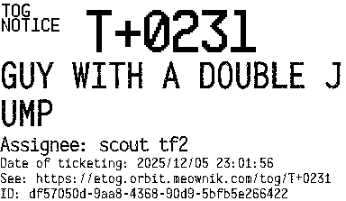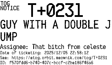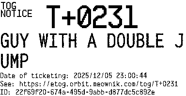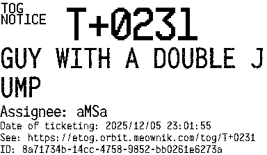 Orbit eTOG Listing Service: T+0231 GUY WITH A DOUBLE JUMP