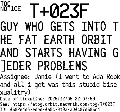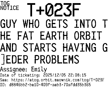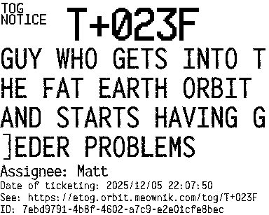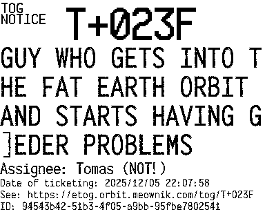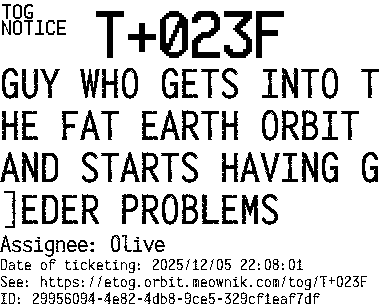 Orbit eTOG Listing Service: T+023F GUY WHO GETS INTO THE FAT EARTH ORBIT AND STARTS HAVING G]EDER PROBLEMS
