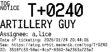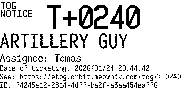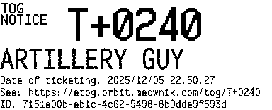 Orbit eTOG Listing Service: T+0240 ARTILLERY GUY