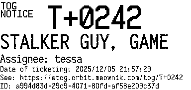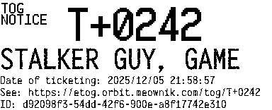 Orbit eTOG Listing Service: T+0242 STALKER GUY, GAME