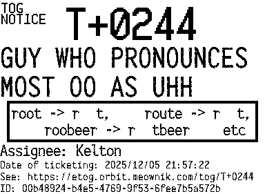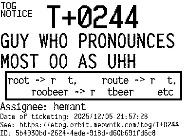 Orbit eTOG Listing Service: T+0244 GUY WHO PRONOUNCES MOST OO AS UHH