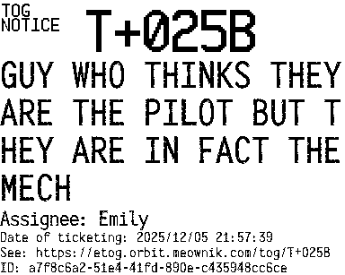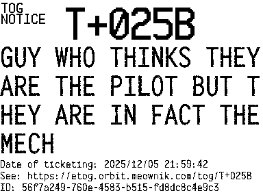 Orbit eTOG Listing Service: T+025B GUY WHO THINKS THEY ARE THE PILOT BUT THEY ARE IN FACT THE MECH