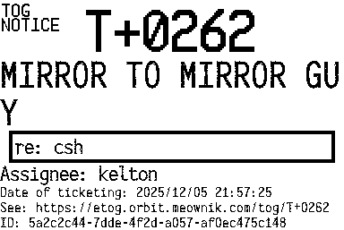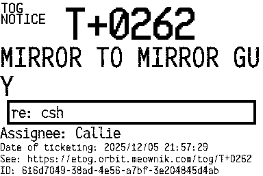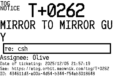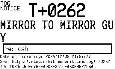 Orbit eTOG Listing Service: T+0262 MIRROR TO MIRROR GUY