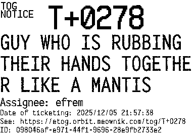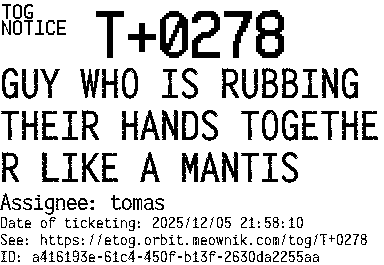 Orbit eTOG Listing Service: T+0278 GUY WHO IS RUBBING THEIR HANDS TOGETHER LIKE A MANTIS