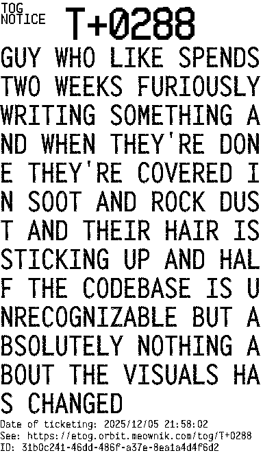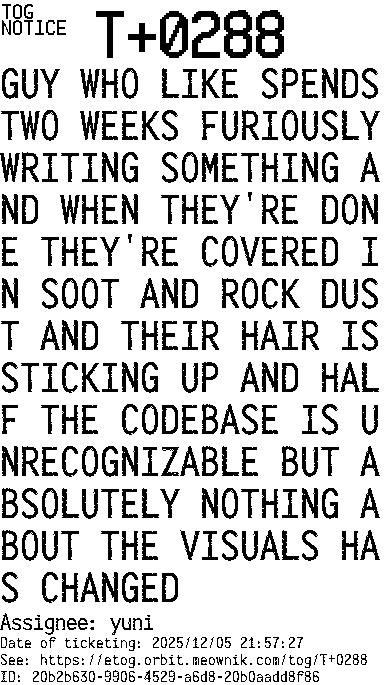 Orbit eTOG Listing Service: T+0288 GUY WHO LIKE SPENDS TWO WEEKS FURIOUSLY WRITING SOMETHING AND WHEN THEY'RE DONE THEY'RE COVERED IN SOOT AND ROCK DUST AND THEIR HAIR IS STICKING UP AND HALF THE CODEBASE IS UNRECOGNIZABLE BUT ABSOLUTELY NOTHING ABOUT THE VISUALS HAS CHANGED