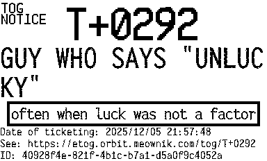 Orbit eTOG Listing Service: T+0292 GUY WHO SAYS "UNLUCKY"