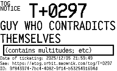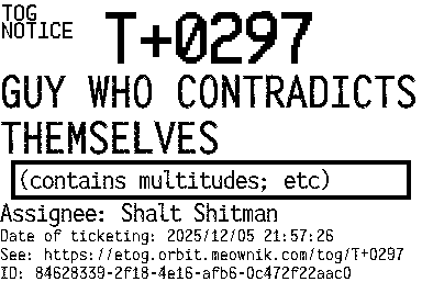Orbit eTOG Listing Service: T+0297 GUY WHO CONTRADICTS THEMSELVES