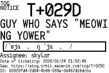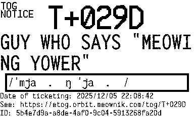 Orbit eTOG Listing Service: T+029D GUY WHO SAYS "MEOWING YOWER"