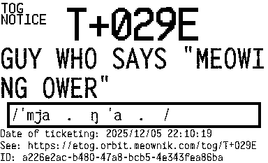 Orbit eTOG Listing Service: T+029E GUY WHO SAYS "MEOWING OWER"