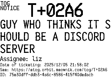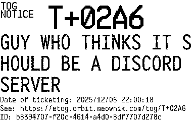 Orbit eTOG Listing Service: T+02A6 GUY WHO THINKS IT SHOULD BE A DISCORD SERVER