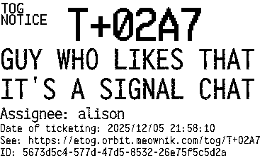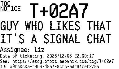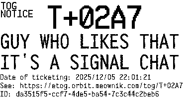 Orbit eTOG Listing Service: T+02A7 GUY WHO LIKES THAT IT'S A SIGNAL CHAT