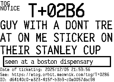 Orbit eTOG Listing Service: T+02B6 GUY WITH A DONT TREAT ON ME STICKER ON THEIR STANLEY CUP