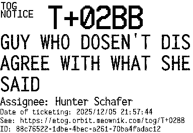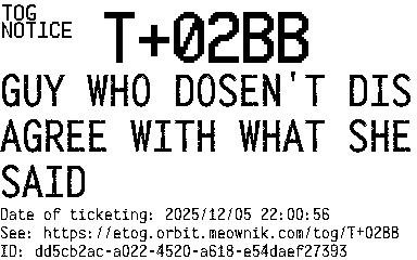 Orbit eTOG Listing Service: T+02BB GUY WHO DOSEN'T DISAGREE WITH WHAT SHE SAID