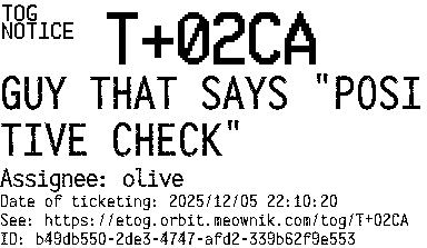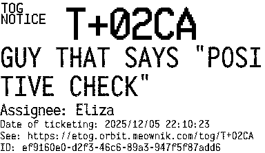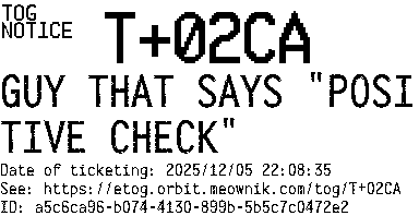 Orbit eTOG Listing Service: T+02CA GUY THAT SAYS "POSITIVE CHECK"