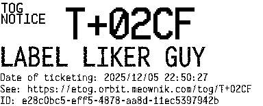 Orbit eTOG Listing Service: T+02CF LABEL LIKER GUY
