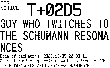 Orbit eTOG Listing Service: T+02D5 GUY WHO TWITCHES TO THE SCHUMANN RESONANCES