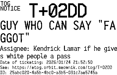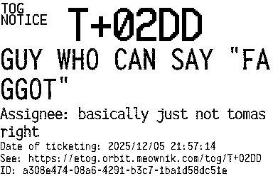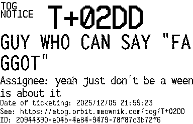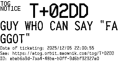 Orbit eTOG Listing Service: T+02DD GUY WHO CAN SAY "FAGGOT"