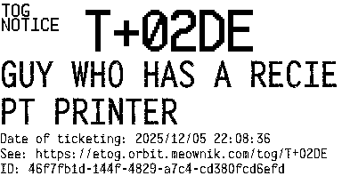 Orbit eTOG Listing Service: T+02DE GUY WHO HAS A RECIEPT PRINTER