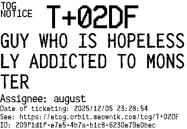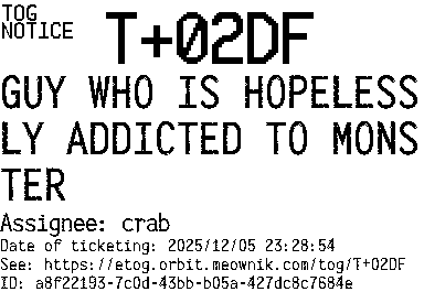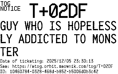 Orbit eTOG Listing Service: T+02DF GUY WHO IS HOPELESSLY ADDICTED TO MONSTER