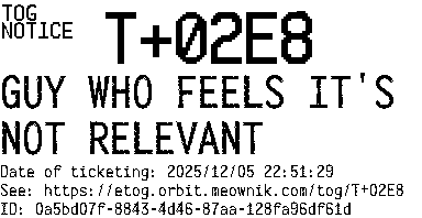 Orbit eTOG Listing Service: T+02E8 GUY WHO FEELS IT'S NOT RELEVANT