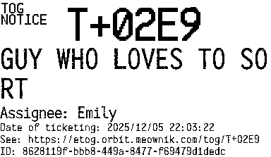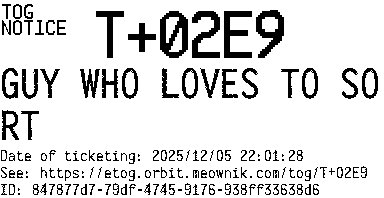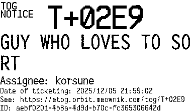 Orbit eTOG Listing Service: T+02E9 GUY WHO LOVES TO SORT
