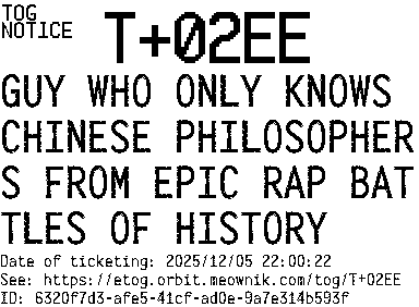 Orbit eTOG Listing Service: T+02EE GUY WHO ONLY KNOWS CHINESE PHILOSOPHERS FROM EPIC RAP BATTLES OF HISTORY