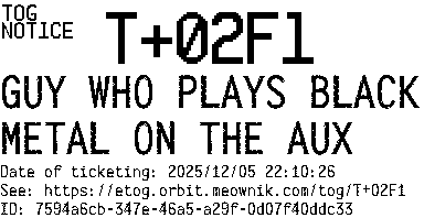 Orbit eTOG Listing Service: T+02F1 GUY WHO PLAYS BLACK METAL ON THE AUX