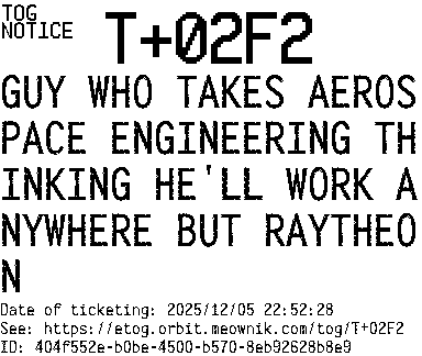 Orbit eTOG Listing Service: T+02F2 GUY WHO TAKES AEROSPACE ENGINEERING THINKING HE'LL WORK ANYWHERE BUT RAYTHEON