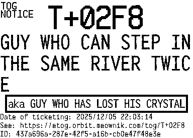 Orbit eTOG Listing Service: T+02F8 GUY WHO CAN STEP IN THE SAME RIVER TWICE