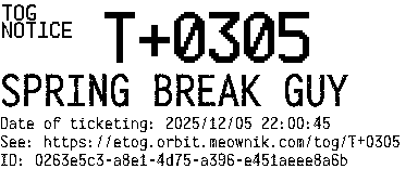 Orbit eTOG Listing Service: T+0305 SPRING BREAK GUY
