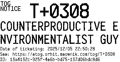 Orbit eTOG Listing Service: T+0308 COUNTERPRODUCTIVE ENVIRONMENTALIST GUY