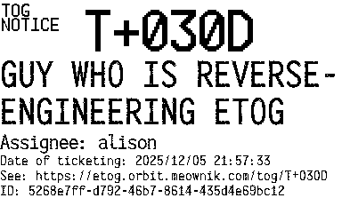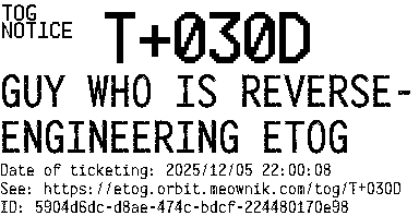 Orbit eTOG Listing Service: T+030D GUY WHO IS REVERSE-ENGINEERING ETOG