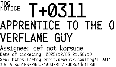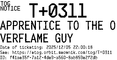 Orbit eTOG Listing Service: T+0311 APPRENTICE TO THE OVERFLAME GUY